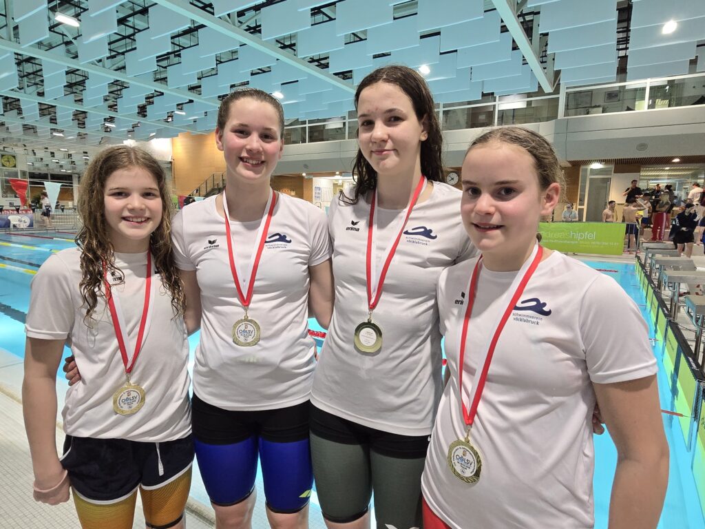 Links: 4 x 50 m Lagen (Mitte) (v. l. n. r.: Sophie Burgstaller, Magdalena Burgstaller, Maria Maak, Hannah Motz)